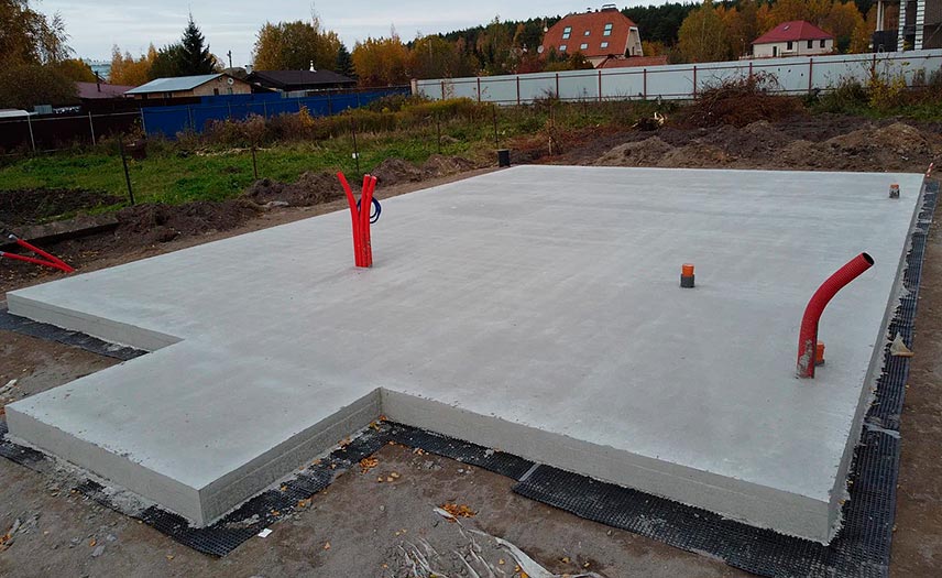 Это наиболее надежный, прочный и устойчивый вариант, представляющий собой залитую по грунту плиту толщиной около 30 см. Длина и ширина ее соответствует размерам здания, с небольшим превышением (10 см) в каждую сторону. Армированная железом конструкция, уложенная на плотно утрамбованную «подушку» из песка и щебня и залитая прямо на стройплощадке, имеет массу плюсов. Это высокая несущая способность на любом виде грунта, равномерное распределение нагрузок (обеспечивает прочностные характеристики), сравнительно небольшой объем земляных работ. Правильно сооруженное и утепленное основание помогает снизить теплопотери и сэкономить на обустройстве чернового пола (им становится верхняя плоскость конструкции). Для строительства нужен ровный участок (на склоне может скользить), а устройство подвала невозможно. Хотя это затратный вариант, его выбирают чаще всего для домов из ЖБИ панелей.