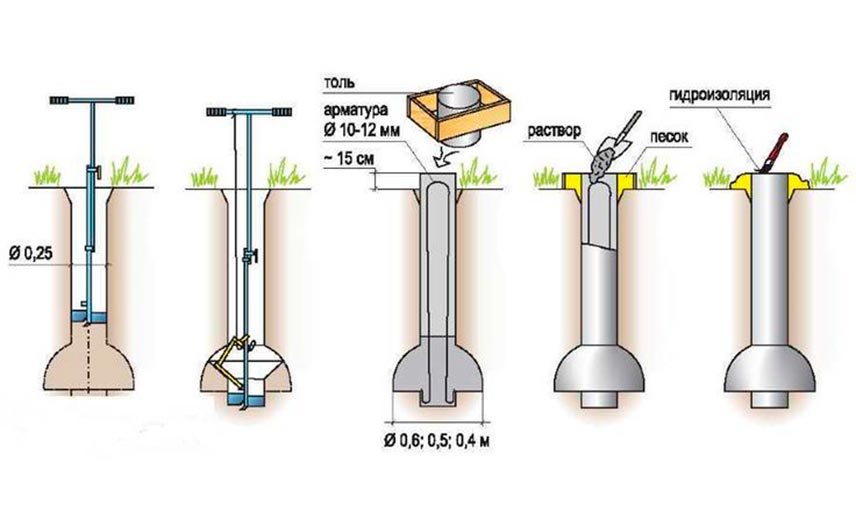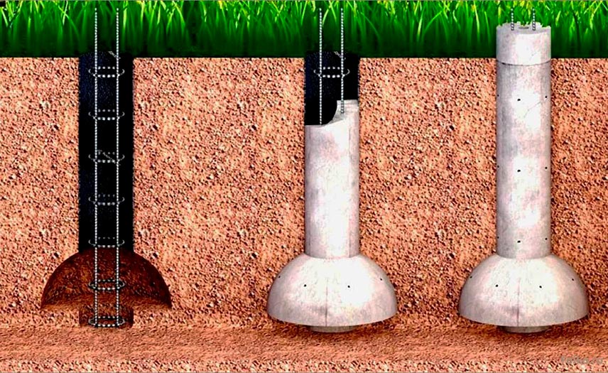 Для опалубки берут рубероид, пергамин или толь в 2-3 слоя: сворачивают в трубку с несколько меньшим диаметром, чем у скважины, и вставляют в отверстие. По длине такая труба должна выступать над землей на 15-20 см. Чтобы при заливке бетона края не разошлись, надземную часть обвязывают проволокой или присыпают грунтом. Для заливки берут бетон марки М250-М300, которым вначале заполняют пятку и с помощью вибропогружателя уплотняют раствор. Затем армируют: 4 рифленых прута Ø 12 мм скрепляют хомутами через каждые 40-50 см с помощью вязальной проволоки. Размеры каркаса должны быть такими, чтобы после заливки раствор покрывал арматуру слоем в 2,5-5 см, поэтому его ставят внизу на пластиковые фиксаторы. Сверху арматура должна выступать над опалубкой на высоту ростверка, не доходя до его верхней плоскости 5 см (для последующего крепления к каркасу ленты).