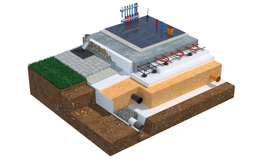 Проектированием занимаются после проведения изыскательских работ: исследуют состав и структуру грунта, определяют УГВ, возможность подвижек почвы. Далее делают расчеты основных характеристик, требующихся для сооружения шведской утепленной фундаментной плиты: глубину заложения, толщину «подушки», размеры дренажной системы. Составляют схему укладки коммуникаций и системы подогрева, рассчитывают параметры армокаркаса, высоту самой плиты.