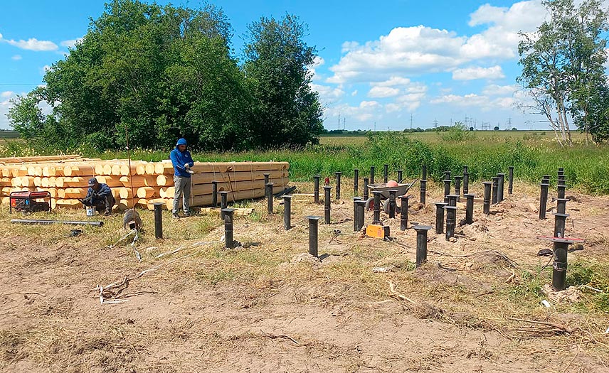 Это самый бюджетный вариант для сруба. Винтовые сваи изготавливаются из металлических электросварных труб с острым лопастным наконечником, покрыты антикоррозийной защитой. Установка таких столбов осуществляется в течение 1 дня, особенно при наличии техники. Также доступен ручной монтаж — рычагом или сваекрутом. Строительные работы доступны для выполнения круглый год и на любых участках: со сложным рельефом (склоны, неровности и т. д.), со слабыми и подвижными грунтами, при заболоченности, в прибрежной зоне, в регионах с вечной мерзлотой. Закрученные в почву опоры соединяют деревянным ростверком (цельный или срощенный брус), для усиления используют швеллер или уголок, все места сварки прокрашивают. Поэтому срок службы таких оснований достигает 80 лет и более (при надежной антикоррозийной защите и покупке качественных столбов). Несущая способность зависит от типоразмера (диаметра ствола) и достигает до 15 т на 1 изделие. Что касается финансовых и трудовых затрат, здесь также значительная экономия — земляные работы практически отсутствуют, а стоимость на 40-50% ниже, чем у конструкции из ж/б свай.