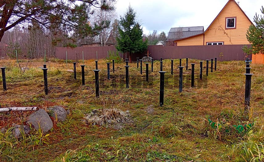 Изготовление таких опор происходит на стройплощадке: в земле бурят шурфы, устанавливают обсадные трубы (иногда самодельные из рубероида), помещают внутрь заранее сделанный армокаркас и заливают бетоном. Позже, после застывания раствора, сооружают обвязку — в зависимости от объекта деревянную или ж/б. Для использования такого решения на болоте необходимо, чтобы с участка была откачана вода, а работы можно проводить лишь в теплое время года. Кроме того, потребуется масса времени и трудовых вложений. Однако при подходящих грунтовых характеристиках, желании выполнить работы своими руками и снизить расходы — это реализуемый вариант. Технология несложная, а при минимальных строительных навыках и знании нюансов — вполне надежная.
