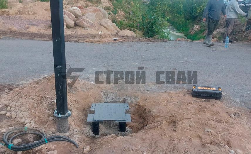 Установка винтовых свай — несложный процесс, который, однако, требует строго соблюдения технологических требований и самого внимательного исполнения. Вначале расчищают площадку под основную стойку, размечают места закручивания опор, ориентируясь на размеры тумбы. Делают приямки до 30 см и приступают к монтажу:
